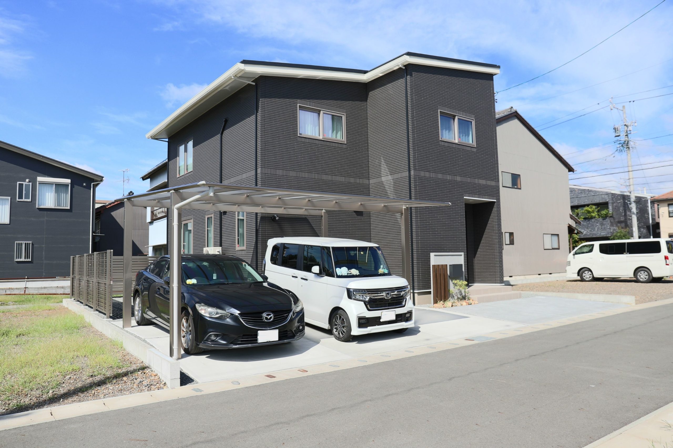 シャープな印象のカーポートはシンプルモダンなお住まいとの相性が良く、