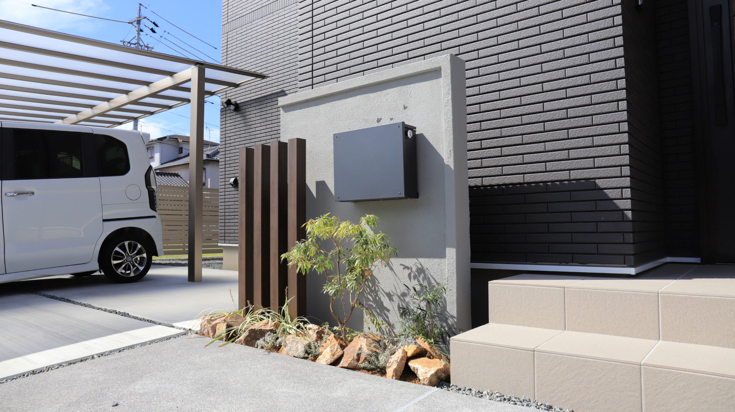 シャープな印象のカーポートはシンプルモダンなお住まいとの相性が良く、 玄関前には建物にマッチしたグレー系の塗り壁、ポスト、表札もモノトーンを選択し、角柱をアクセントとして配置しました。