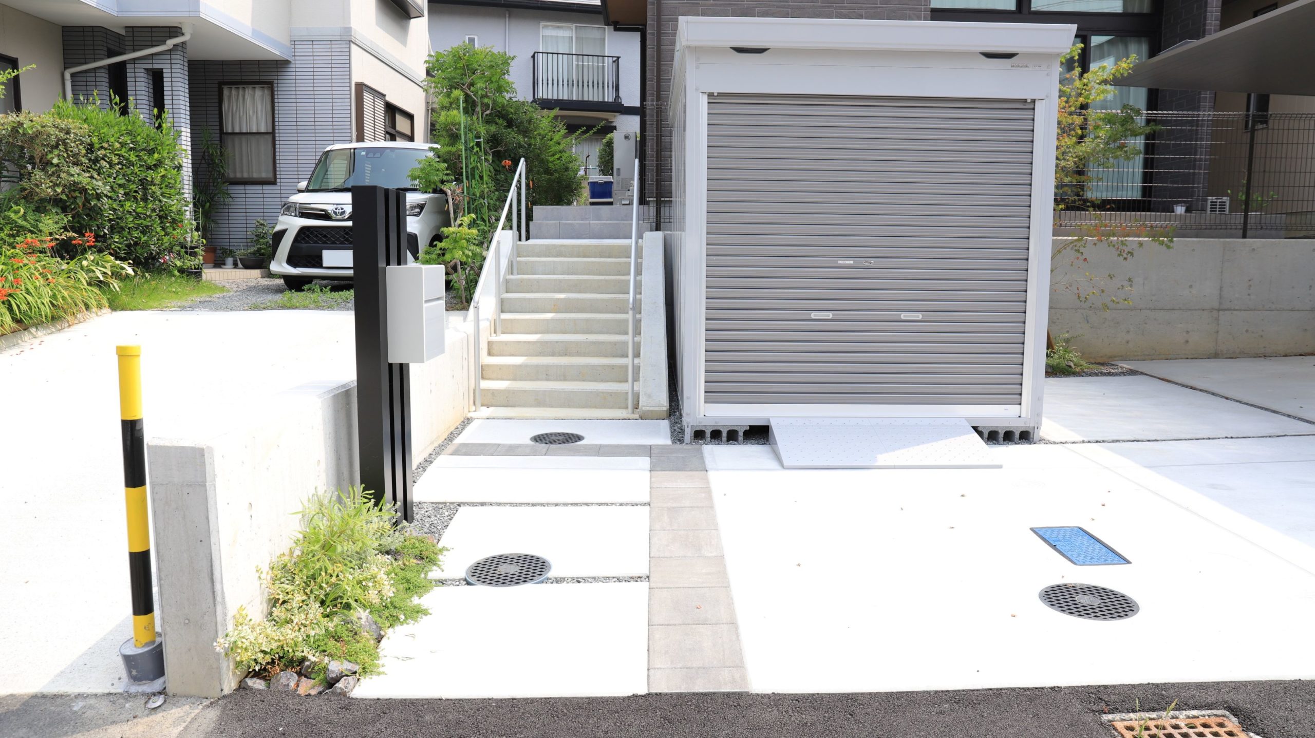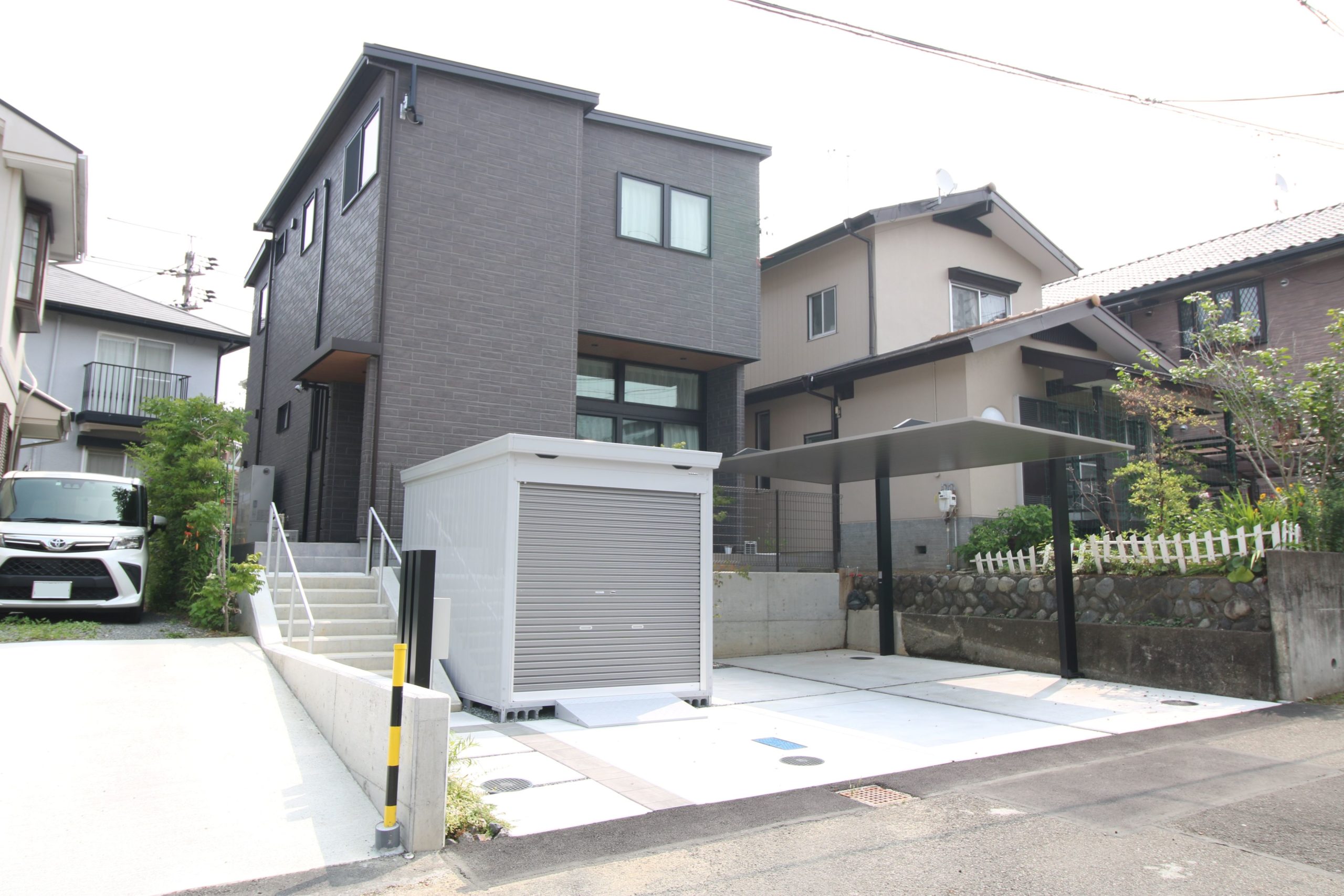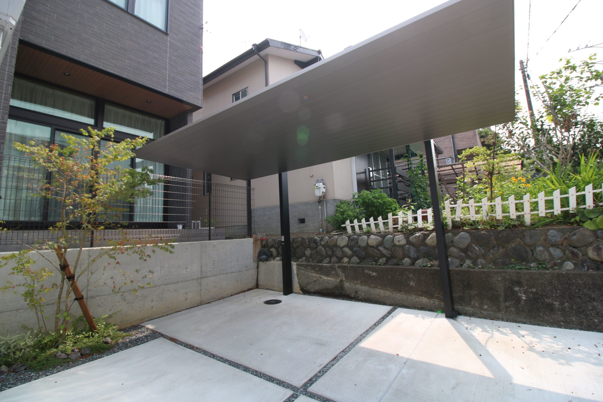 デザイン性の高いカーポートが印象的な、モダンなエクステリア。全体をモノトーンで統一しながら、機能性とデザイン性をバランス良く両立させています。直線的でスタイリッシュな構成の中にも、ポケットガーデンとしてグリーンを取り入れることで、潤いとやすらぎを感じられる空間に。風通しの良い爽やかなデザインが、日常を快適に彩ります。