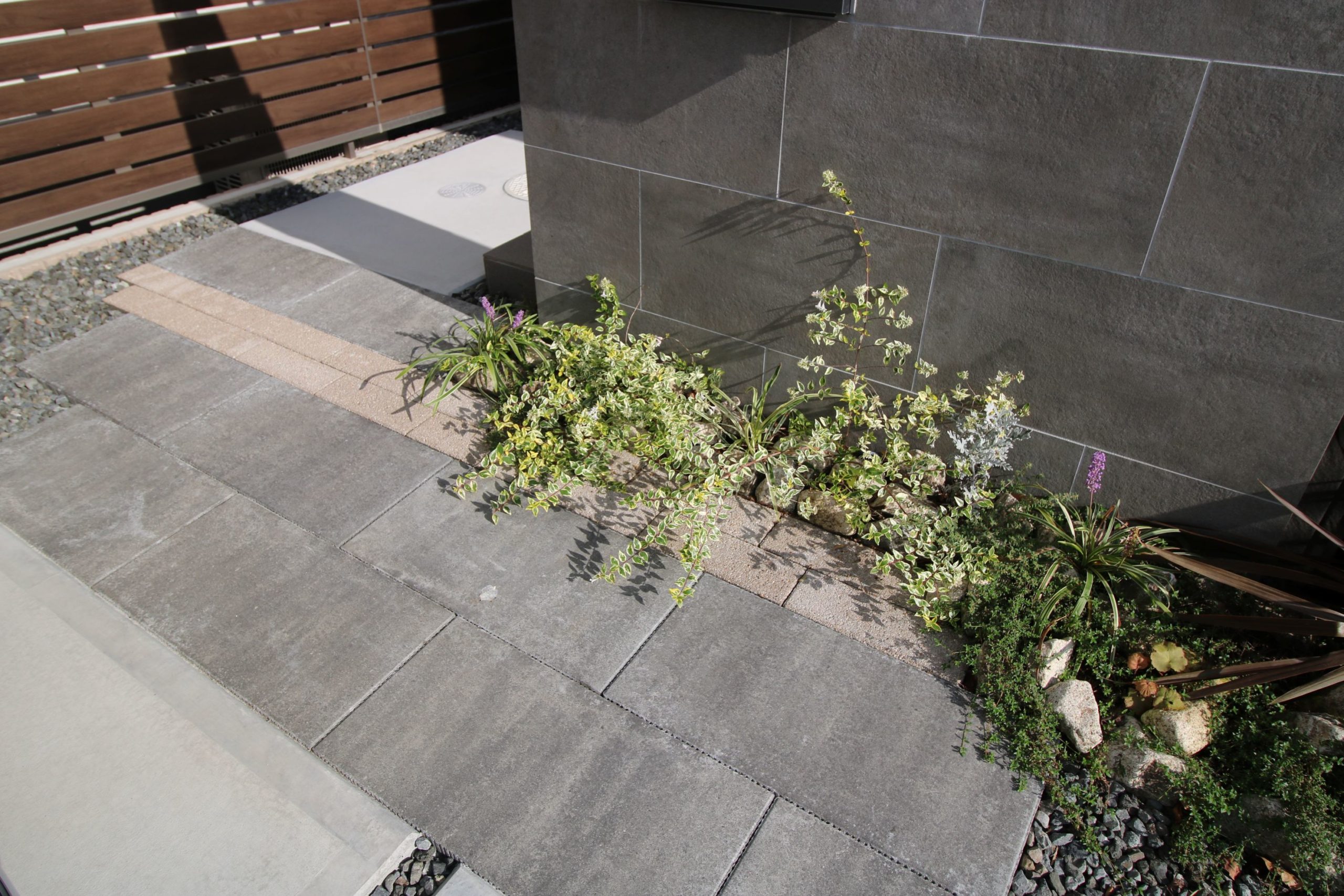 重厚感もある門袖の足元にサイズと色を変えた舗装材や下草類を植えることで柔らかさと動きを出しています。